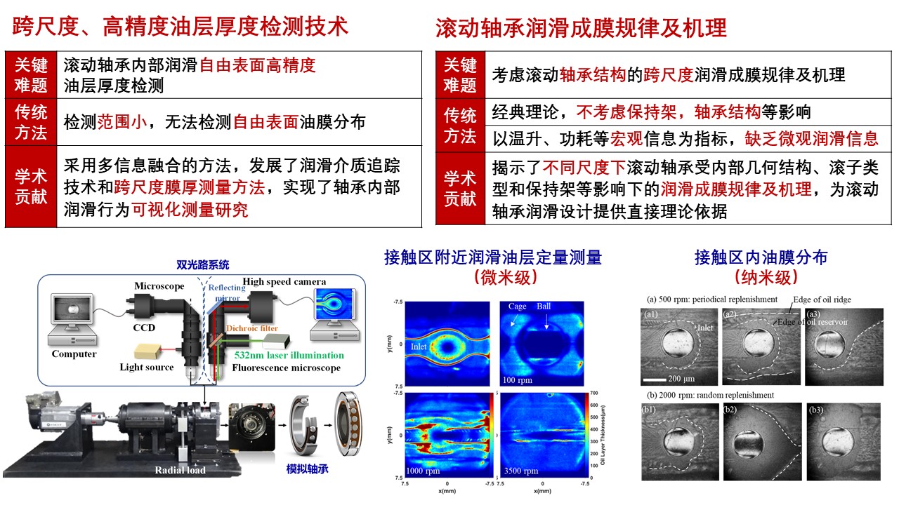 针对重大装备用滚动轴承、齿轮等关键基础零部件,开展多场耦合动力学建模研究;采用多信息融合的方法,发展润滑介质追踪技术和跨尺度膜厚测量方法,实现轴承等内部润滑行为可视化测量。以滚动轴承内部润滑油层的定量测量为基础,揭示滚动轴承受内部几何结构、滚子类型和保持架等不同于经典球盘接触理论的润滑成膜规律及机理,为滚动轴承润滑优化设计提供直接理论依据和技术手段。