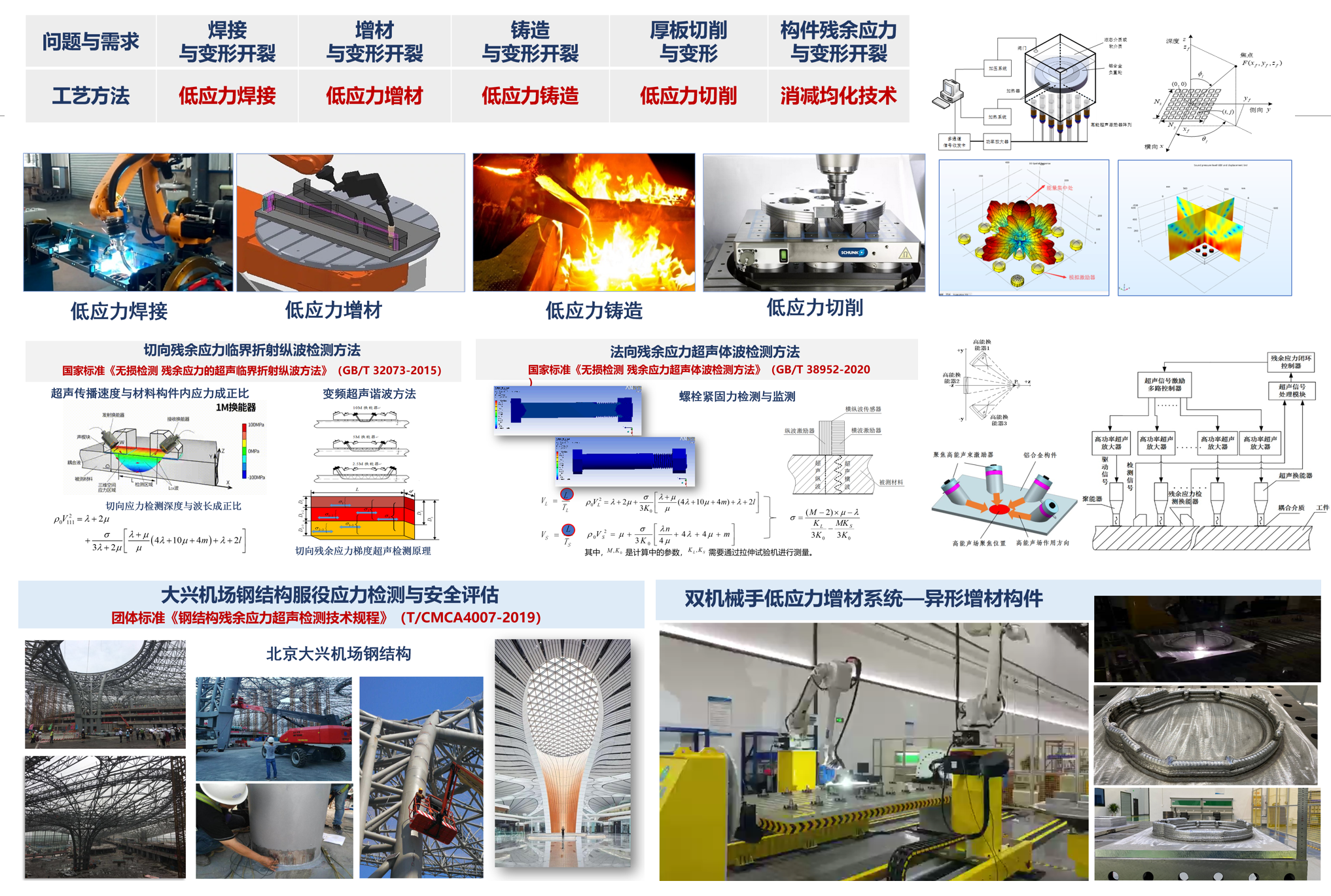 在国家“XXX-6”领域工程专项、173计划重点研究、科技部国家重点研发计划、国家自然基金重点等项目资助下,系统化地创建了低应力制造原理和技术,突破了残余应力超声无损检测技术、低应力焊接、增材、切削、铸造以及折弯等高能声束调控机理和方法关键技术研究,形成了针对不同构件机械加工方式的原位低应力制造技术,实现了加工构形廓精度和保形能力的跨越提升。