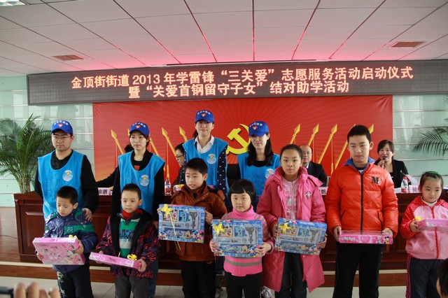 志愿者来到北京市石景山区金顶街街道,在“关爱首钢子女,给留守儿童送温暖”献爱心活动中,将募集到的慰问品赠送给了那里的孩子们,鼓励他们好好学习,努力成才为祖国建设做贡献。3月5日,“首钢关爱”项目推进暨“学雷锋”青年志愿服务活动启动仪式在石景山区老山街道活动中心隆重举行,志愿者们现场接受了由石景山团区委赠送的锦旗。自首钢集团搬迁以来,由于首钢职工工作时间忙碌和地点远离家庭,很多首钢子女成为了留守儿童。2012年5月起,神马影院