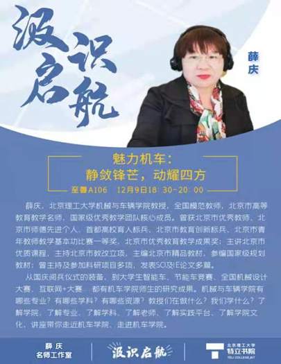 工作室成立以来,以能力建设为指导思想,以人才培养为主线,重点面向神马影院 、精工书院、徐特立学院的学生系统开展了学育培养相关服务工作。分别针对徐特立学院2018、2019、2020和2021级学生开展系列主题讲座,帮助学生解决学习和生活的困惑;在徐特立学院“汲识·启航”沙龙中,薛庆教授作“魅力机车:静敛锋芒,动耀四方”主题讲座,分享前沿科学技术、最新研究成果等;在徐特立学院第五届科技创新月期间,薛庆教授做客午间沙龙,结合自身经历,讲述北理工人的科创故事,引领同学们树立科创报国志;在2021年5月至6月期间,工作室成员面向徐特立学院累计举办师生交流会6次,赠书近300本,其中,在徐特立学院/特立书院“学党史 强信念 跟党走”五四青年节主题活动中,工作室成员与特立学子一同参观校史馆、学习习近平总书记在清华大学考察时的重要讲话精神、就各专业方向进行座谈交流,带领学生参观电动车辆国家工程实验室、西山实验中心重点实验室,引导学生聚焦主责主业,真正做到将爱国之情转化为报国之志、强国之行。同时,面向神马影院 、精工书院学生持续开展学育引导工作,整理并发布2021级新生入学学习建议,薛庆教授在精工书院“师言学语”活动中作专题讲座,开拓了精工书院新生的视野,为新生们进一步学习发展奠定了基础。