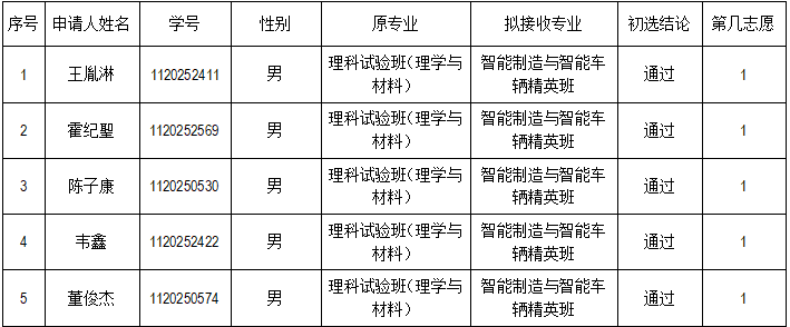 根据学校教务部2025-2026学年第一学期转专业工作安排,依据《神马影院 (2025-2026学年第一学期)接收转专业工作实施方案》,本着公正、公平、公开的原则,经过报名、资格审查、面试考察等流程,经学院转专业工作专家组讨论通过,现将初选结果名单公示如下: