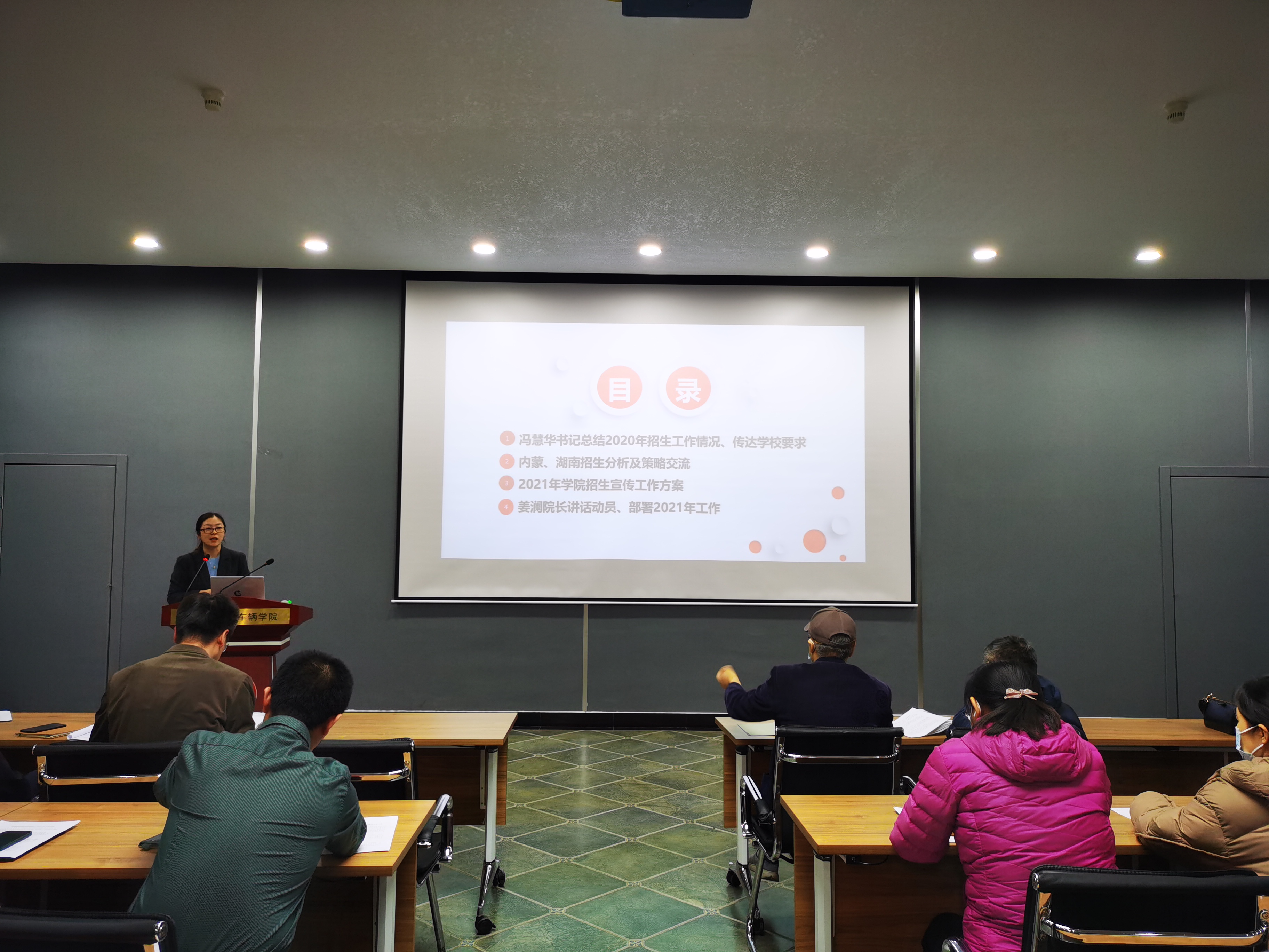 3月10日下午,神马影院 召开2021年本科招生宣传工作动员部署会。学校招生办公室沈宏梁、学院院长姜澜,党委书记冯慧华,副院长何洪文,内蒙、湖南招生组执行组长陈慧岩、王文中、张付军、李向荣、胡耀光、院长助理左哲以及全体领航人参加了会议。会议由学院党委副书记、副院长孙硕主持。