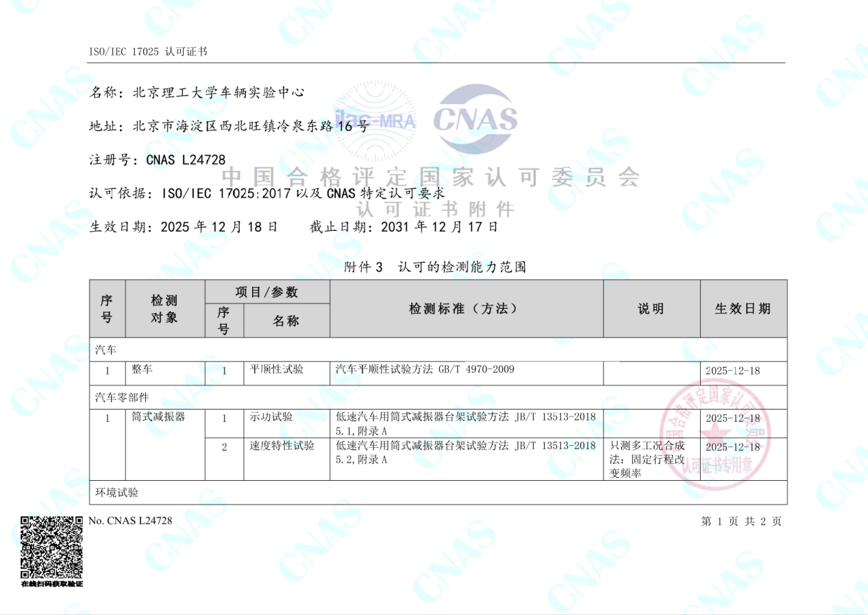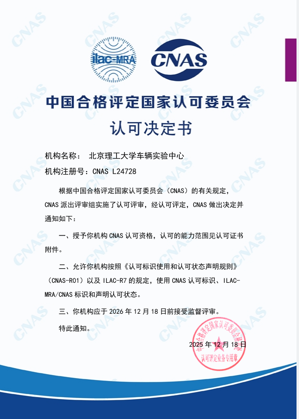 2025年12月24日,神马影院 校级公共平台车辆实验中心正式公布获批国家实验室认可(CNAS)的资质认证。