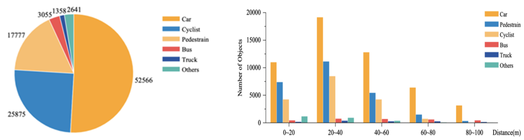 Dual Radar数据集的采集车辆如图1所示,包含了四种传感器,分别为高分辨率相机、激光雷达和两种不同类型的4D雷达:Arbe Phoenix和ARS548 RDI,具体参数配置如表1所示。该数据集共包含151个连续时间序列,涵盖了10007个同步标注帧,数据集的类别包括汽车、行人、骑行者,公交车、卡车和其他物体,类别数量和距离分布如图2所示。该数据集涵盖了多个具有挑战性的场景,包括:不同的道路条件(城市道路和隧道);不同的天气条件:晴天、阴天和恶劣天气(雨天等);不同的光照强度:正常光照和逆光;不同的时间段:白天、黄昏和夜间,三维目标检测标注情况如图3所示。这些场景的多样性能够帮助研究人员验证不同传感器在各种环境下的表现,并为自动驾驶系统提供更全面的测试数据。