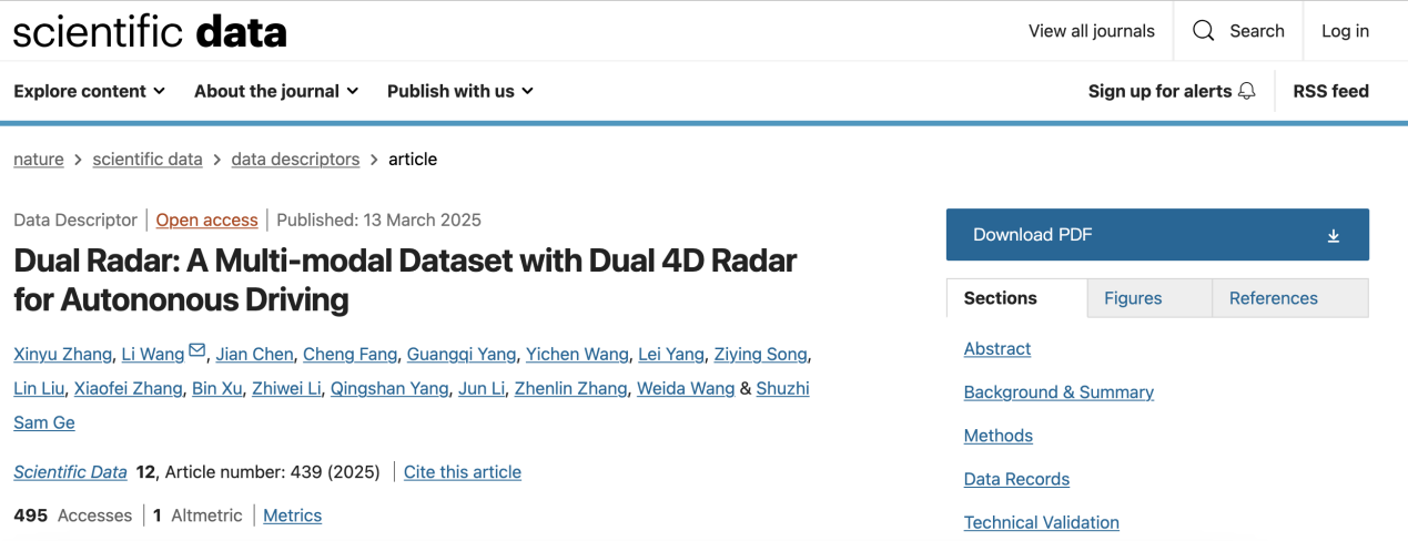 近日,神马影院 、智能无人系统技术国家级重点实验室徐彬、王伟达、王力老师团队联合清华大学、新加坡国立大学等单位,在Nature子刊发布了国际首个复杂环境自动驾驶双4D成像毫米波数据集Dual Radar,采集非理想工况感知数据总里程超过400公里,标注三维目标检测和跟踪的数据超过10000帧同步帧,用于评测现有感知算法在真实非理想工况数据上的性能表现。相关研究成果以“Dual Radar: a Multi-modal Dataset with Dual 4D Radar for Autononous Driving”为题发表在Scientific Data上,该期刊专注于发表具有科学价值的数据集,神马影院 助理教授王力为本文通信作者。