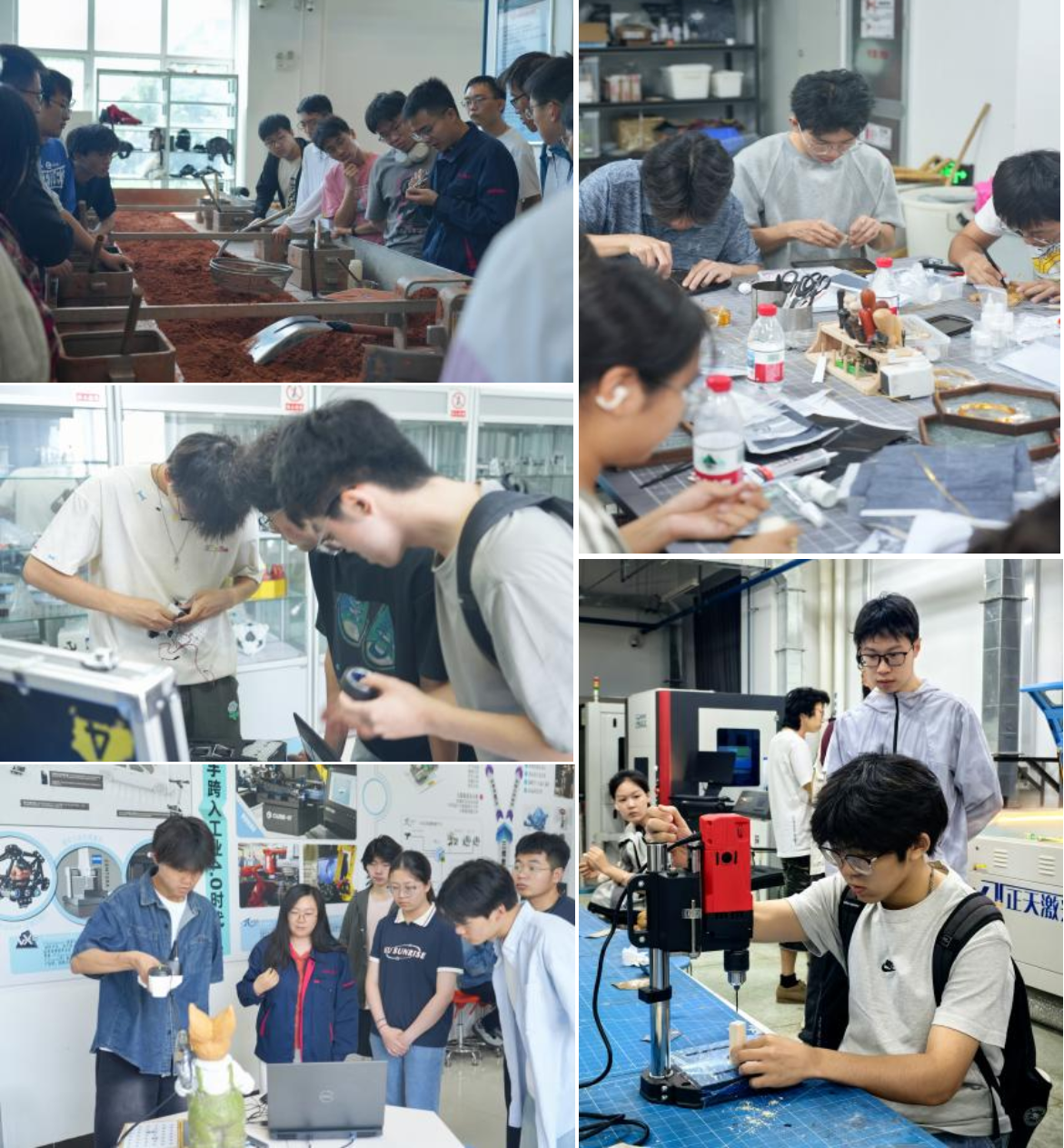 在互动问答环节,同学们围绕专业发展、科研入门等话题与名师、学长展开热烈交流。随后,全体学生分组参与项目制实践活动,体验材料成型工艺探索、掐丝珐琅艺术实践、激光加工技术体验、逆向设计与增材制造、格斗机器人设计制作等特色项目。活动期间,来自薛庆名师工作室的10余名青年教师代表分赴各项目组,与同学们深入交流,答疑解惑。通过“理论-实践-反思”闭环学习,学生们直观感受工程魅力,进一步明确了未来发展方向。
