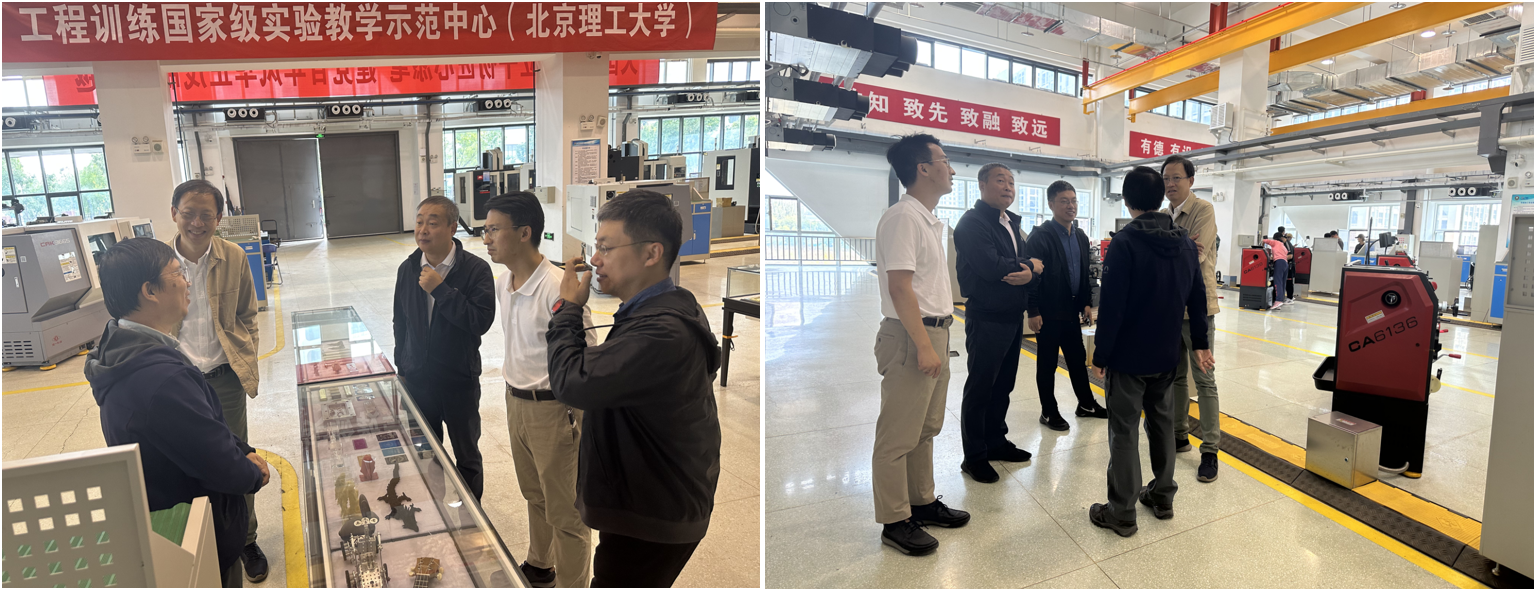 工训中心副主任马树奇介绍了工训中心的主要情况,并带领张惊雷一行参观了劳动与思政教育基地、传统制造车间、先进制造车间、智能制造生产线等实践教学场地,双方就场地建设、实践设备、师资队伍建设等情况进行了交流。