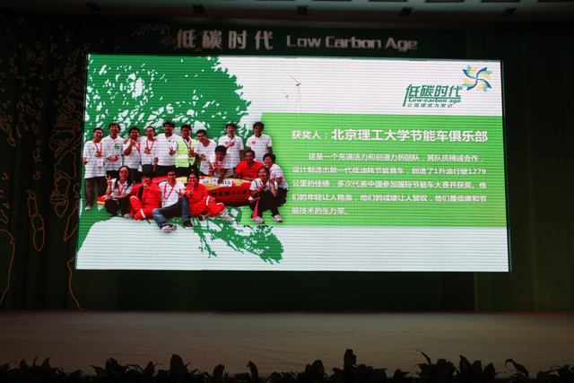 低碳人物致敬盛典中介绍我校节能车俱乐部时提到,神马影院 节能车俱乐部设计的节能车最好节能记录为1升油行驶1279公里,多次代表中国参加国际比赛并获奖,向人们展示了科技创新带给节能环保的无限可能,为中国的低碳事业带来了希望。中央党校原教育长郝时晋、气候组织大中华区总裁吴昌华为节能车俱乐部颁奖。