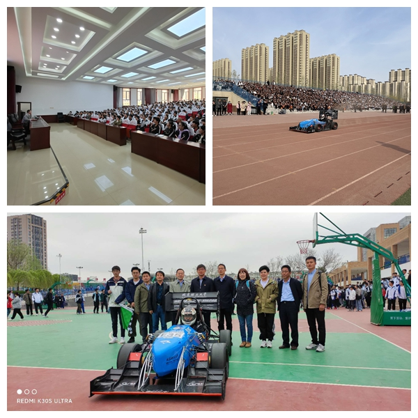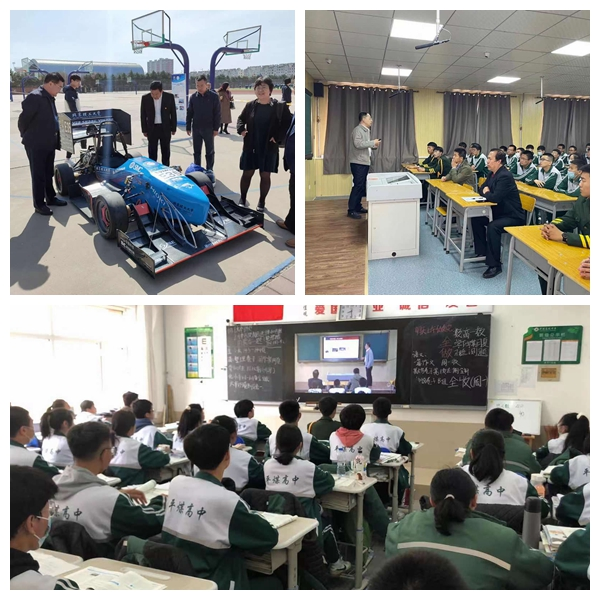 在红旗中学,学校校长及全校师生在操场观看了北理工方程式赛车展示表演,全场掌声雷动,学生纷纷试驾体验,反响热烈,铭记“北理工”及创新人才培养特色。王文中教授进行了《相约北理 共筑梦想》招生宣讲报告,周天丰教授分享了题为《智能制造 创造未来》的学科讲座,加深了各年级学生对我校办学、科研、人才培养特色的了解,激发了科技创新热情和对报考北理工的向往。