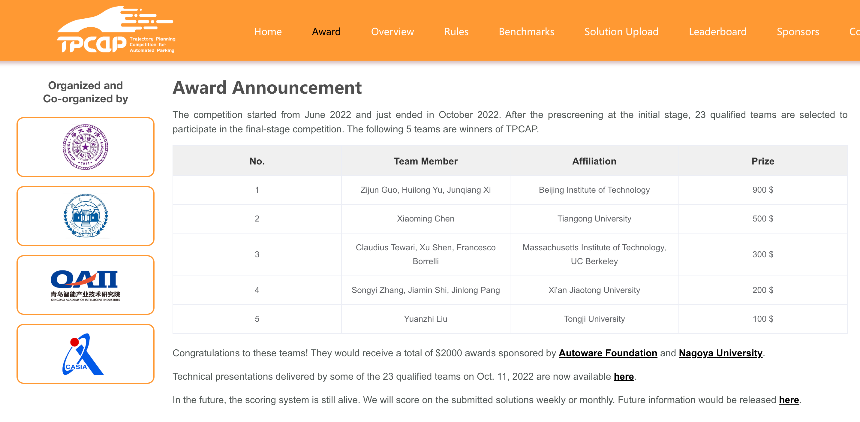 大会设立自主泊车轨迹规划全球挑战赛(Trajectory Planning Competition for Automated Parking,TPCAP)。神马影院 汽车研究所郭子隽博士、于会龙教授、席军强教授团队获得挑战赛第一名。