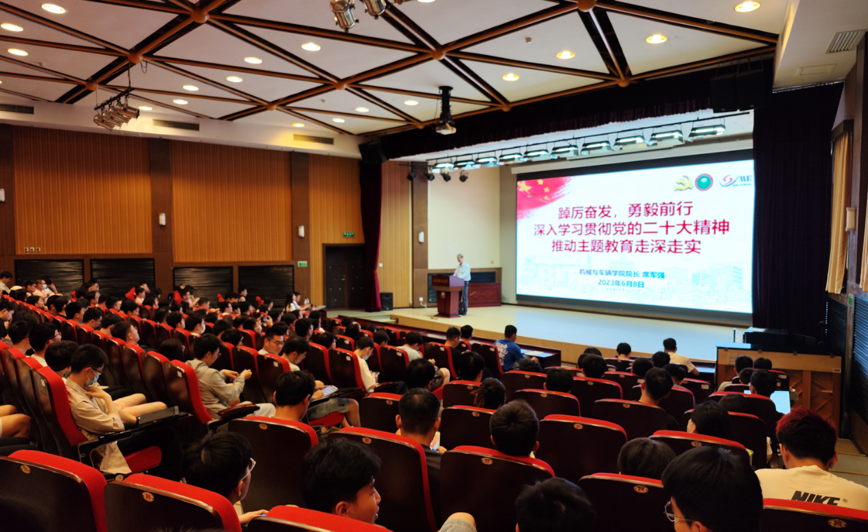 席军强以《踔厉奋发,勇毅前行 深入学习贯彻党的二十大精神 推动主题教育走深走实》为题,结合学校双一流建设和学院高质量发展进行了讲述。首先,他带领大家学习了主题教育的重大意义,之后,他以主题教育的总要求“学思想、强党性、重实践、建新功”作为切入点,依次对教育、科技、人才“三位一体”重要性,“以学铸魂、以学增智、以学正风、以学促干”锤炼党性,“为学之实,固在践履”投身实践以及学院以高质量党建引领高质量发展取得的成就展开了详细阐释。最后,他引用习近平总书记的讲话,鼓励同学们踔厉奋发、勇毅前行,为全面建设社会主义现代化国家、全面推进中华民族伟大复兴而团结奋斗。